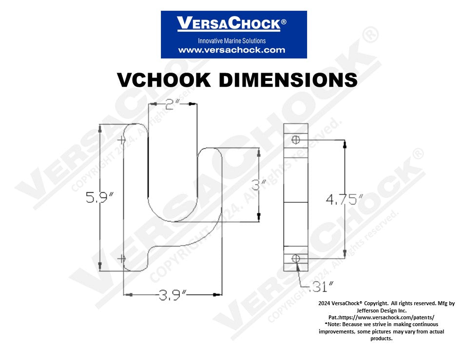 VersaChock Dock line and boat hook holder is perfect for storing dock lines, boat hooks, and other uses. Holds up to 30 feet of ½” dock line. Made with 1” thick HDPE. 2” throat x 2 ½”. Kit includes two hooks and four #12 x 1 3/4” oval head screws. Size: Approximately 6” x 4” x 1”.